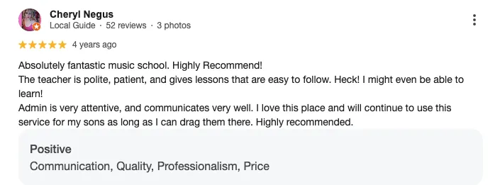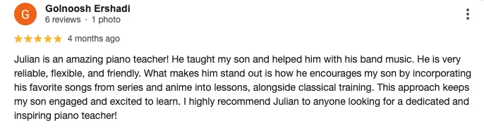 Personalized Teaching Approach: Lessons are tailored to align with your individual goals - want to play Zelda songs like Aiden? Love violin like Trisha? We listen to what YOU want to achieve.